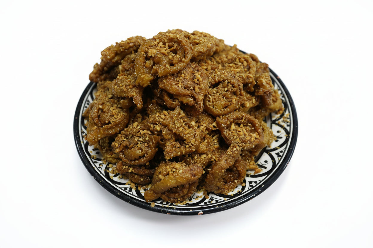 La chebbakia est une pâtisserie marocaine emblématique, particulièrement appréciée pendant le mois de Ramadan, mais dégustée également tout au long de l’année. Elle est préparée à partir d’une pâte finement travaillée, façonnée en forme de fleur, puis frite jusqu’à obtenir une texture croustillante. Ensuite, elle est généreusement plongée dans du miel chaud et parsemée de graines de sésame. Parfumée à l’eau de fleur d’oranger et relevée d’épices telles que la cannelle et l’anis, elle offre une saveur riche et délicatement aromatique.